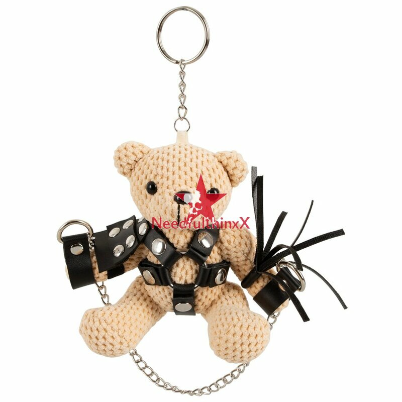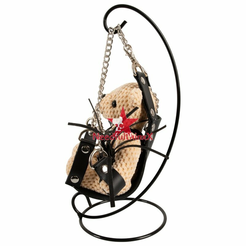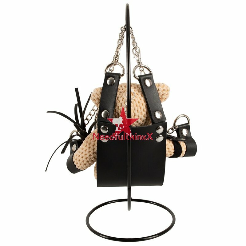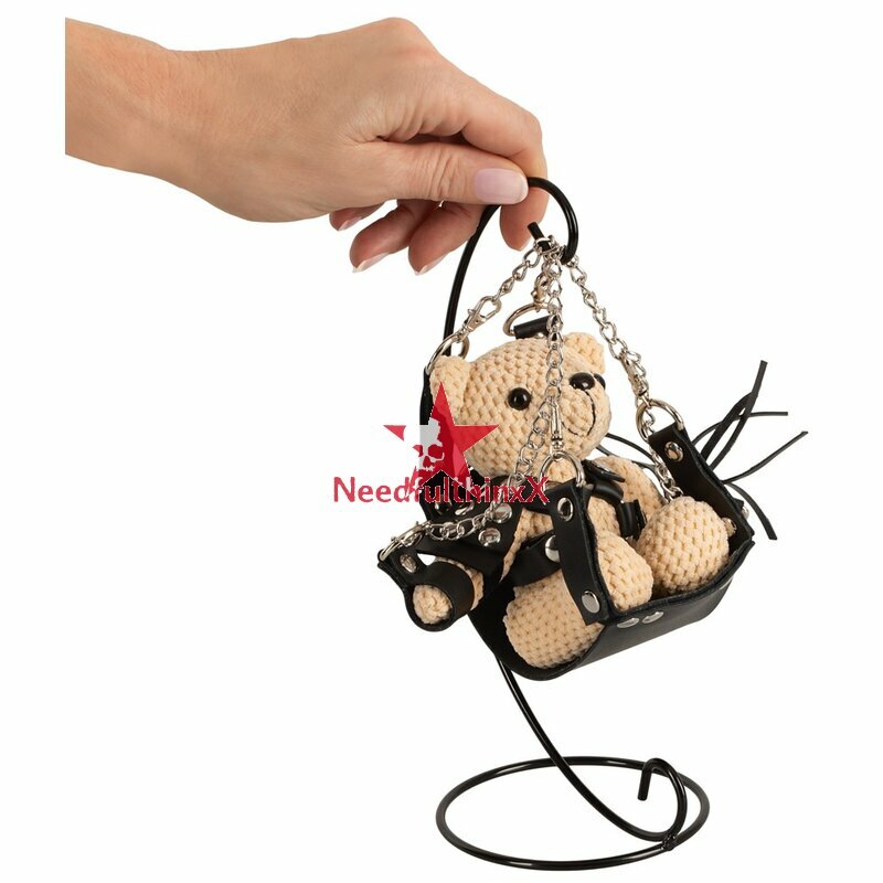 Handzahmer kleiner SM-Teddy with Swing von Bad Kitty. Teddy in gehäkelter Optik und superweich im Griff. Ausstaffiert im typischen SM-Look mit Harness, Fesseln und Mini-Peitsche aus schwarzem Lederimitat. Am Kopf ein Schlüsselanhänger mit Kettchen und Ring. Die kleine stilechte Slingmatte wird einfach in das Metallgestell der Mini-Sexschaukel (Swing) eingehängt – und schon kann Teddy Platz nehmen …