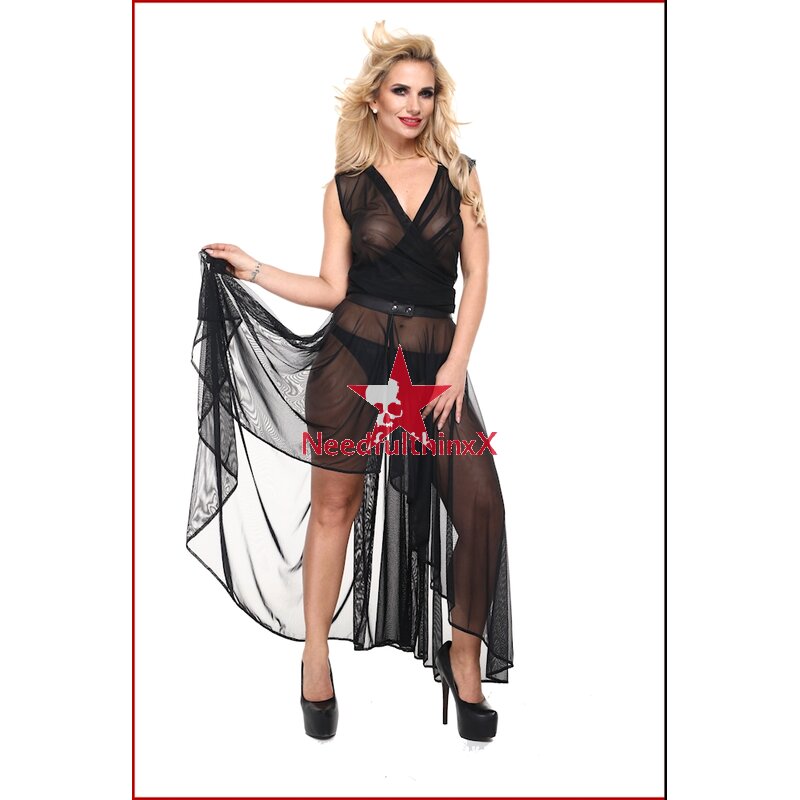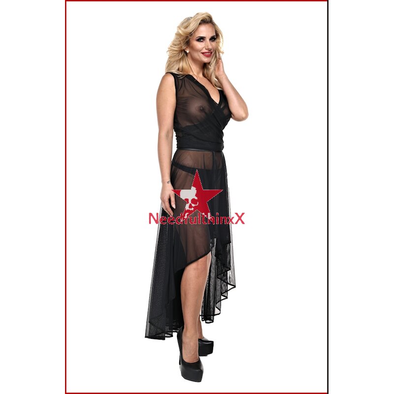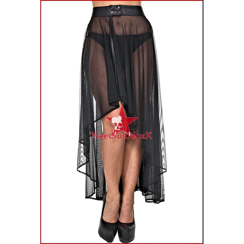 Hinten lang, vorne kurz und rundum transparent. Das ist der erotische Trick dieses eleganten Rocks aus weichem schwarzen Tüll. Ein Hauch von Nichts umspielt sanft und weit fallend ihre Beine und Hüften. Der bequeme Bund ist aus schwarzem Wetlook, der mit 4 Druckknöpfen vorne geschlossen wird. Dadurch entsteht vorne ein sexy Schlitz, der seine Wirkung nicht verfehlt, wenn Sie die Beine übereinanderschlagen.