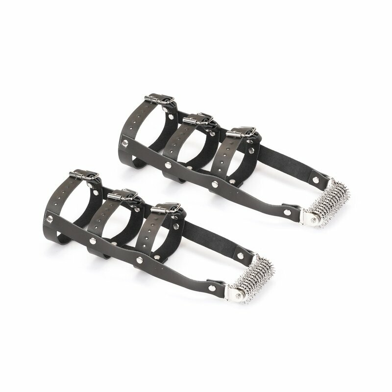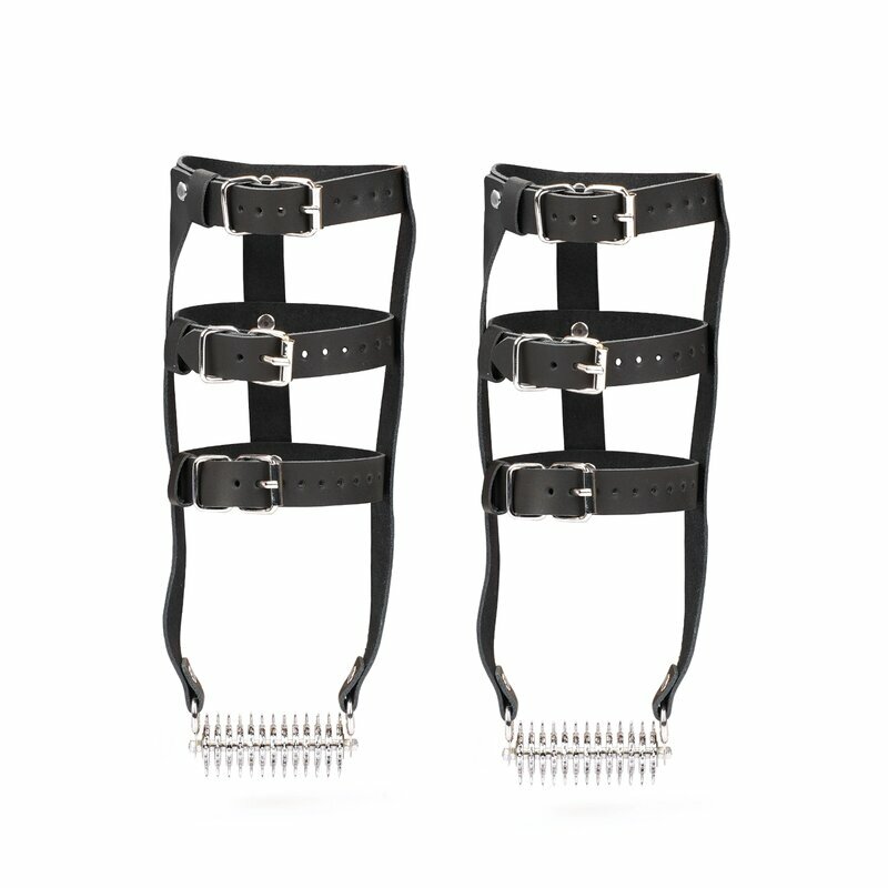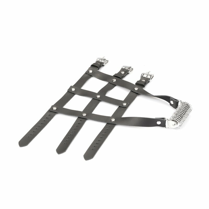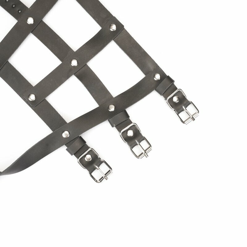 Verflochtene Lederfesseln: Gefertigt aus drei strengen Bändern aus geschmeidigem schwarzem Leder, die mit kaltgeschmiedeten Stahlnieten und verstellbaren Schnallenverschlüssen sicher befestigt sind – jede Fesselung ist ein bewusster Akt der Dominanz und sorgt für einen ebenso strengen wie perfekten Sitz.