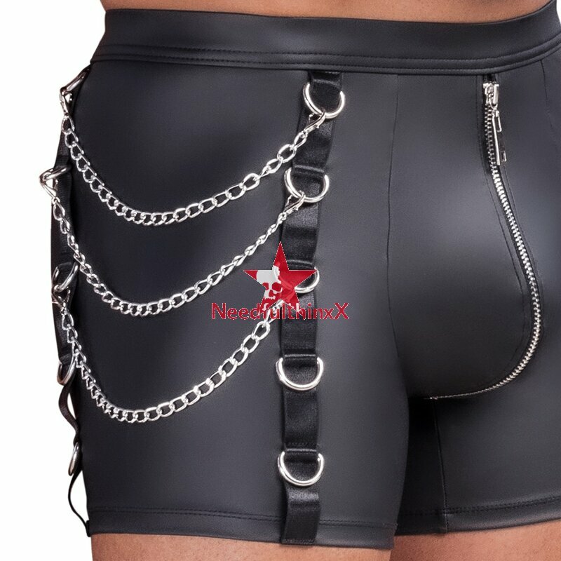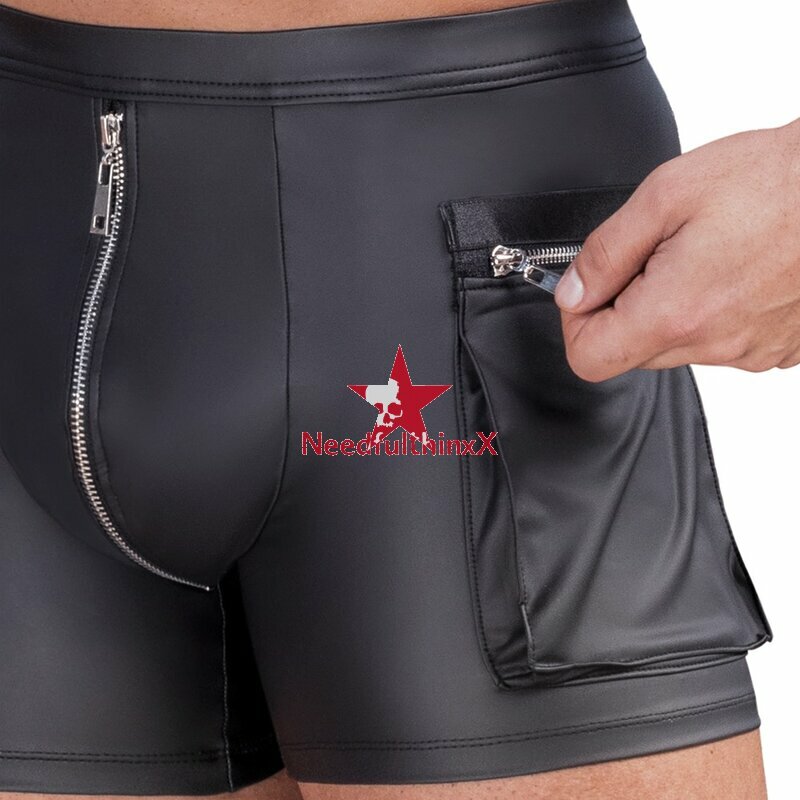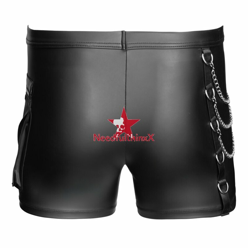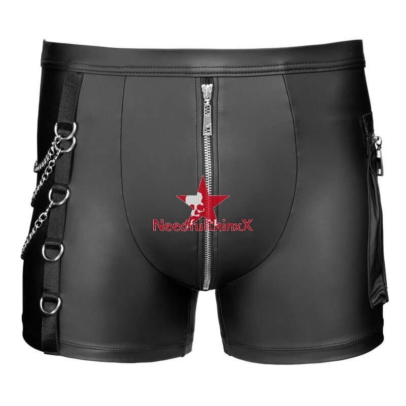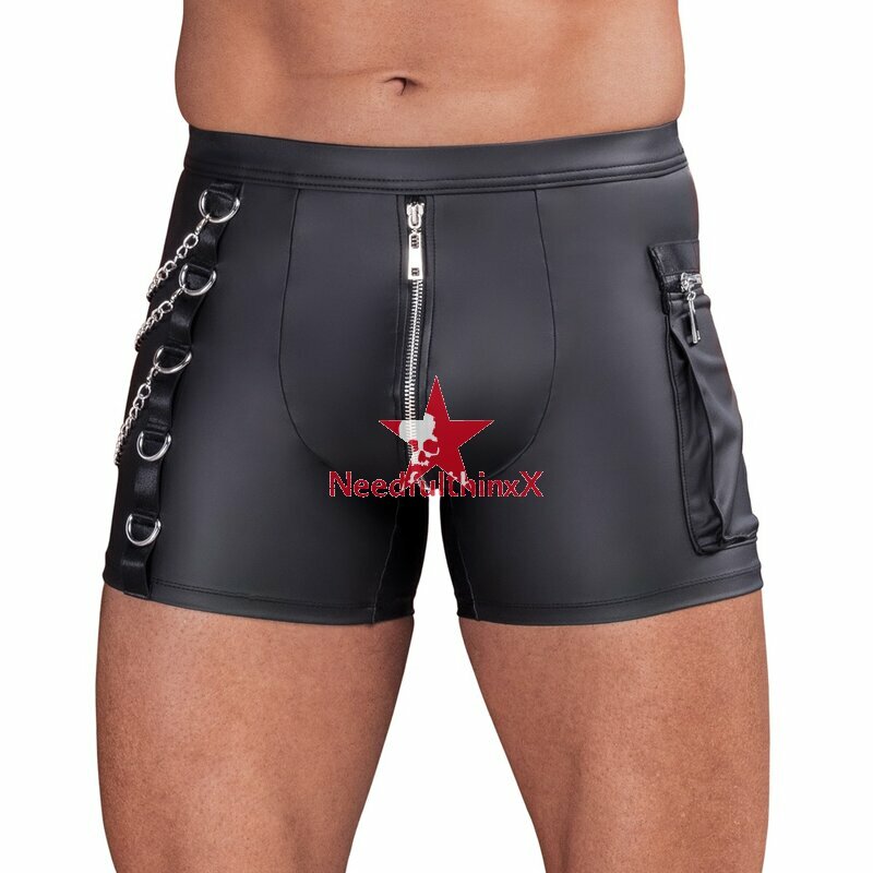 Enge betonende Pants von NEK im coolen schwarzen Mattlook mit silberfarbenen Details. Weich, elastisch und mit bezogenem Bundgummi für maximalen Tragekomfort. Mit unterlegtem Reißverschluss im Beutel. Auf der einen Seite mit Ringen und 3 abnehmbaren Karabiner-Ketten, auf der anderen Seite eine aufgesetzte Cargotasche mit Reißverschluss.