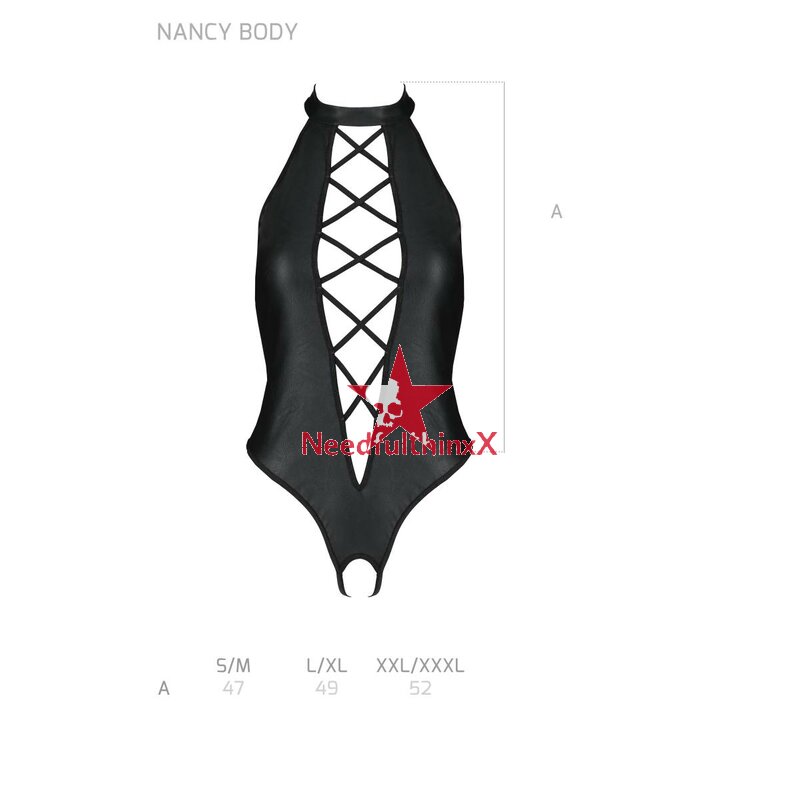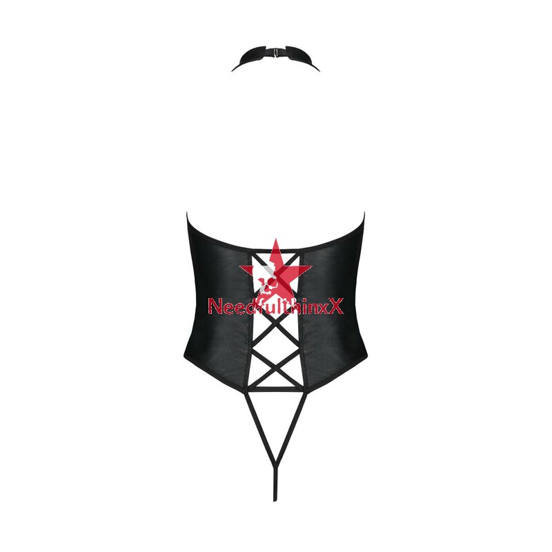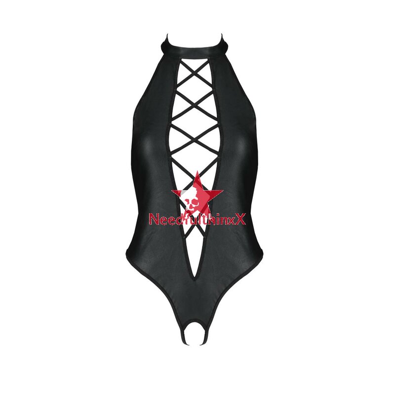 Wetlook-Bodysuit mit offenem Schritt mit Riemchendetails vorne und hinten. Das dehnbare Material sorgt für einen schönen, passgenauen Sitz. Häkchenverschluss im Nacken.