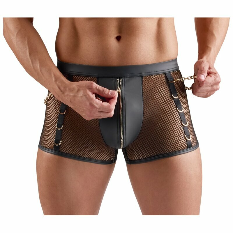 Betonende schwarze Pants von Svenjoyment aus zeigefreudigem Netzmaterial im Mix mit angesagtem Wetlook. Mit Reißverschluss im blickdichten Beutel. Rundum elastisch und weich anschmiegsam für hohen Tragekomfort. Dekorative goldfarbene Ringe jeweils vorne seitlich und hinten am Bund. Die beiden goldfarbenen Karabinerketten sind abnehmbar.