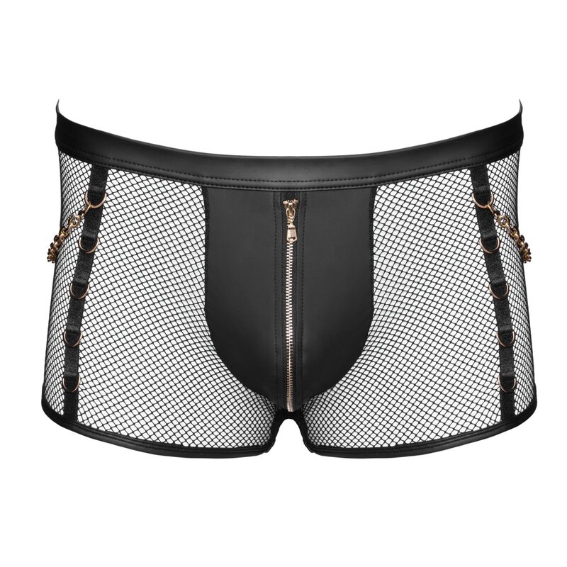 Betonende schwarze Pants von Svenjoyment aus zeigefreudigem Netzmaterial im Mix mit angesagtem Wetlook. Mit Reißverschluss im blickdichten Beutel. Rundum elastisch und weich anschmiegsam für hohen Tragekomfort. Dekorative goldfarbene Ringe jeweils vorne seitlich und hinten am Bund. Die beiden goldfarbenen Karabinerketten sind abnehmbar.
